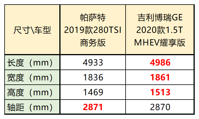 我们先看一下这两款车的尺寸对比表现:
