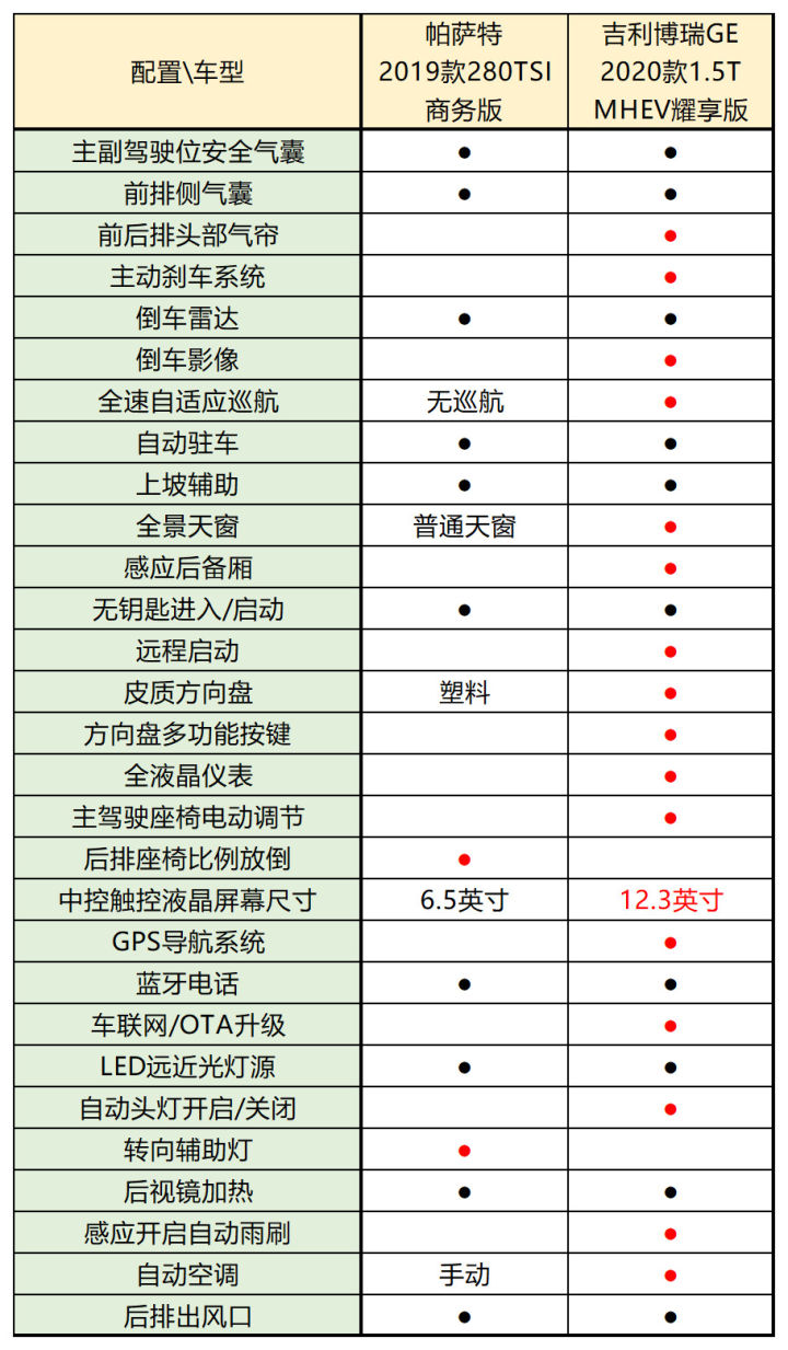 现在有了直观印象了吧?同价位的话,博瑞GE多了前后排头部气帘、倒车影像、全速段自适应巡航、全景天窗、感应后备厢、全液晶仪表、12.3英寸液晶屏、主驾驶座电动调节、自动大灯、自动可温区分控空调这些重点配置。应该反过来说,入门版帕萨特的配置实在有点太低了...。