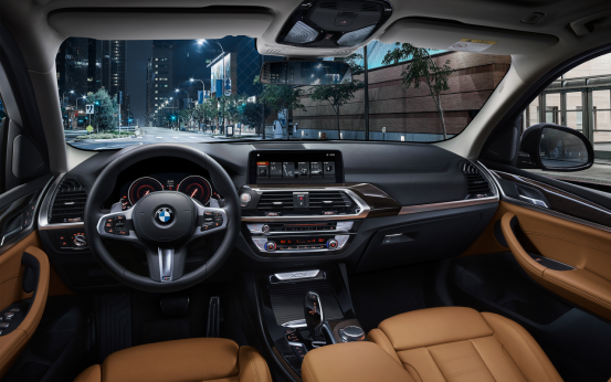 内饰方面,宝马X3的布局和设计并没有什么惊喜可言,标准的宝马风格。中控台上方依旧为防眩目的荔枝纹样式,材质和手感都不错,按上去也挺柔软。12.3英寸的中控液晶屏幕在不同的驾驶模式下,可以调整显示样式。方向盘的皮质细腻,手感非常出色。