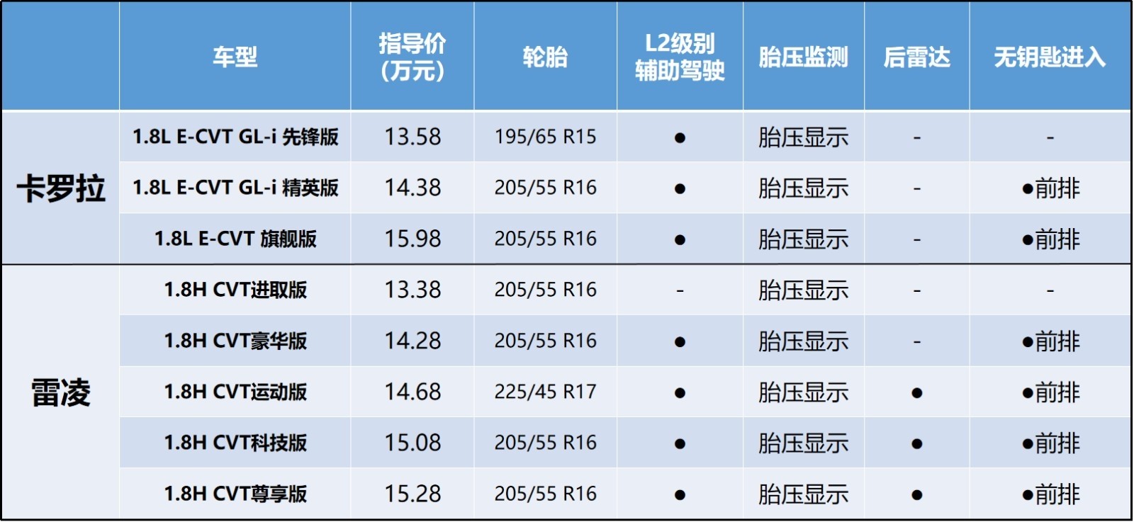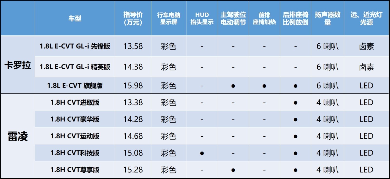 两台车在起售价上有所差距。卡罗拉起售价为11.98万元,而雷凌起售价为11.58万元。那么差出来的4千元能够说明雷凌的性价比更高吗?来看看这两台车的配置对比就一目了然。