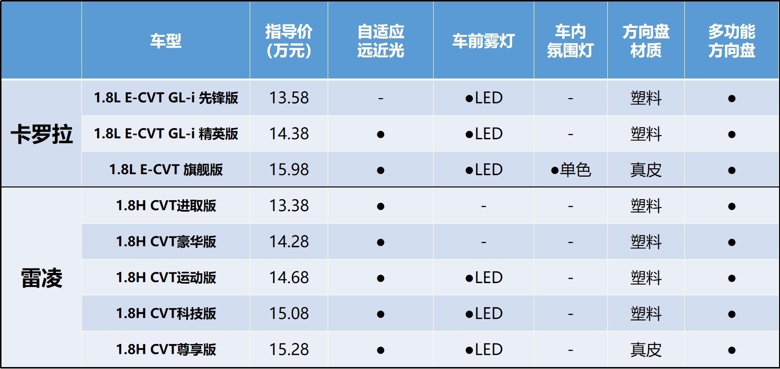 双擎版的起售价上,雷凌依旧是相比于卡罗拉低了2千元的价格。在最低配车型中,卡罗拉多出了L2级别的辅助驾驶功能(车道偏离预警、车道保持系统、主动刹车、ACC自适应巡航)、6喇叭扬声器以及LED车前雾灯,而雷凌多出了16寸轮胎、后排座椅比例放倒、LED远/近光灯以及自适应远近光。对于它们的取舍,更多的还是看你的需求了。
