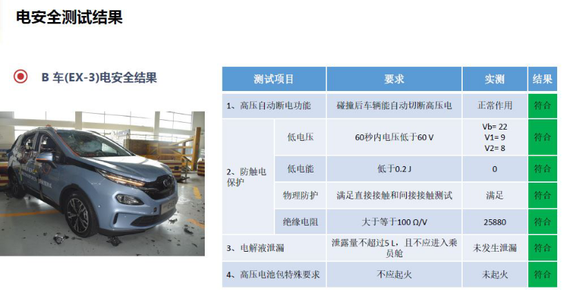 本次测试的追尾工况以国标进行电安全评价,而侧面碰撞工况按照2018版C-NCAP规则进行电安全以及乘员伤害值评价,以重点考查BEIJING-EX3的车身结构强度、乘员保护能力以及三电系统安全性。