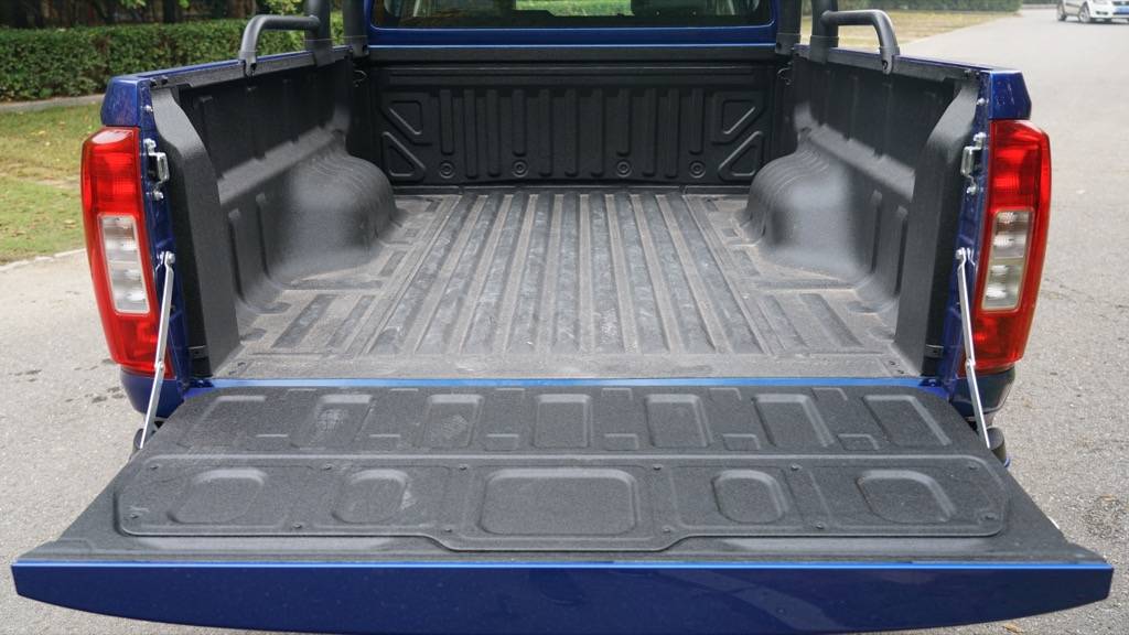 车身侧面一眼看上去非常圆润饱满,车身尺寸方面,标准轴车型的车身尺寸为5362/1883/1884mm,轴距3230mm;长轴版车型的车身尺寸为5602/1883/1884mm,轴距为3470mm。长轴版轴距增加的部分全部体现在货厢进深方面,货厢尺寸分别为1520/1520/538mm和1760/1520/538mm。