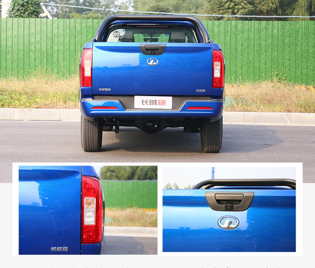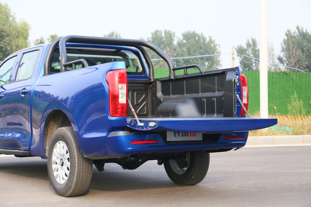 车尾造型方正较为普通,配有黑色防滚架颇为冷峻。商用版的尾灯不再是立体造型,尾灯罩更换为普通的红白色,货箱后挡板造型也更为平整一些,取消了装饰性线条。该车后保险还集成了上车踏板的功能。另外在货箱扳手处带有倒车影像,这样日常泊车会更为方便。
