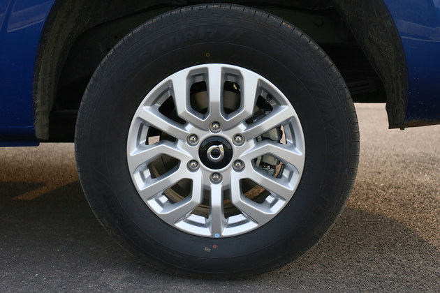 试驾车使用规格为245/70 R17的朝阳牌轮胎,其匹配了与乘用版车型不同的轮毂造型,样式较为普通。前后盘刹、9.3版ESP、胎压显示系统等没有在该车型上缺席,这对于皮卡车型来说都是加分项。
