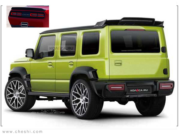 外观方面,铃木全新吉姆尼五门版车型延续了此前经典的方正设计理念,整体造型与奔驰G级相似度更高。其中套件版车型前脸并未悬挂铃木车标,保险杠两侧雾灯组由进气口代替,引擎盖上方配有导风口,提供给了引擎及油路更好的散热条件。车侧下方选用多辐式铝合金轮毂,车尾取消备胎设置,上方配有大尺寸扰流板,尾灯组样式也区别于普通版车型,与道奇挑战者 较为相似。动力方面,新车或将搭载1.0T发动机或1.5L自然吸气发动机,并配备四驱系统。