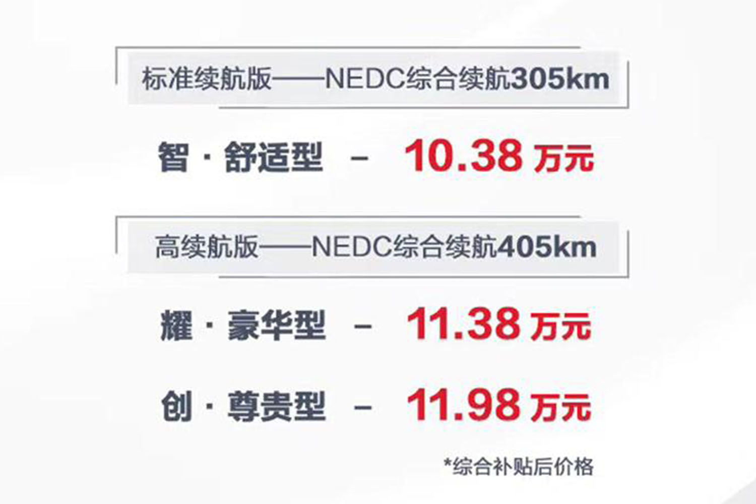 10月24日,比亚迪e3 (配置|询价)正式上市,新车共推出3款车型,官方补贴后指导价为10.38-11.98万元,其中智•舒适型工况续航里程为305km,耀•豪华型与创•尊贵型工况续航里程为405km。