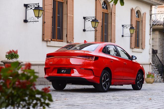 车身侧面线条比e2的设计要更加流畅,侧裙辅以蓝色饰条,搭配低风阻轮圈,突出新能源身份,车尾运用贯穿式尾灯设计,配合配合灯组上沿处翘起的棱线,富有层次感。