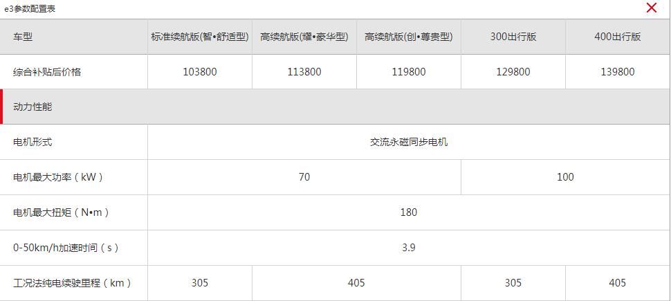 比亚迪e3搭载了比亚迪自主研发的永磁同步发动机,提供两个续航版本的车型。其中,续航里程为305km的车型配备最大功率为95Ps(70kW)的电机;续航里程为405km的车型配备一台最大功率为136Ps(100kW)的永磁同步电机。