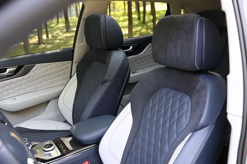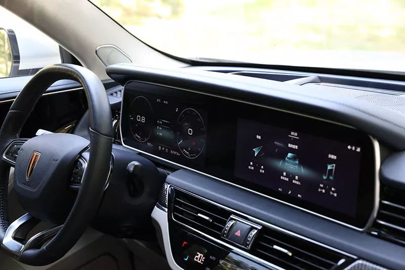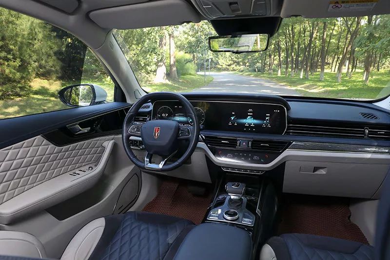 前面已经极力褒扬了红旗HS5的外形设计,进入车内,第一感受就是满满的豪华风。最吸引眼球的就是双12.3英寸一体大屏,看起来很高端,全液晶仪表有三种显示模式,我最喜欢经典模式,仪表指针上有红旗车标,很有大牌味道。HS5的座椅是顶级的Nappa真皮和Alcantara混搭的样式,钻石型的缝线,填充物厚实,软硬度适中,对身体的支撑很充分;头枕的尺寸也很大,车门扶手和车门内衬也都有真皮包裹,总之,触手可及处都是真皮。此外,头顶是全景天窗、眼旁有流媒体后视镜、耳畔是BOSE音响,手里的方向盘带加热,还有电动调节……你能想到的好东西,HS5都有。