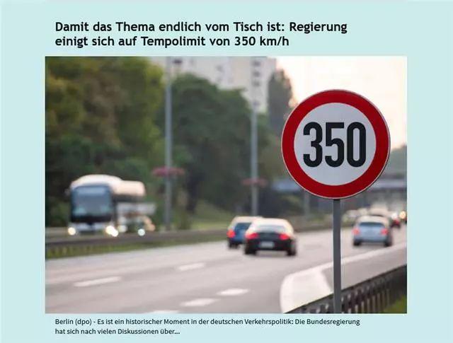 这个消息的源头和照片均来自Der Postillon,其在文章中说“德国政府已经同意建设一条最高时速限制为350km的高速公路”,并在文章的结尾,还嘲讽的补了一刀“如果汽车销量高居不下,政府也许会考虑把限速提高到400km。”