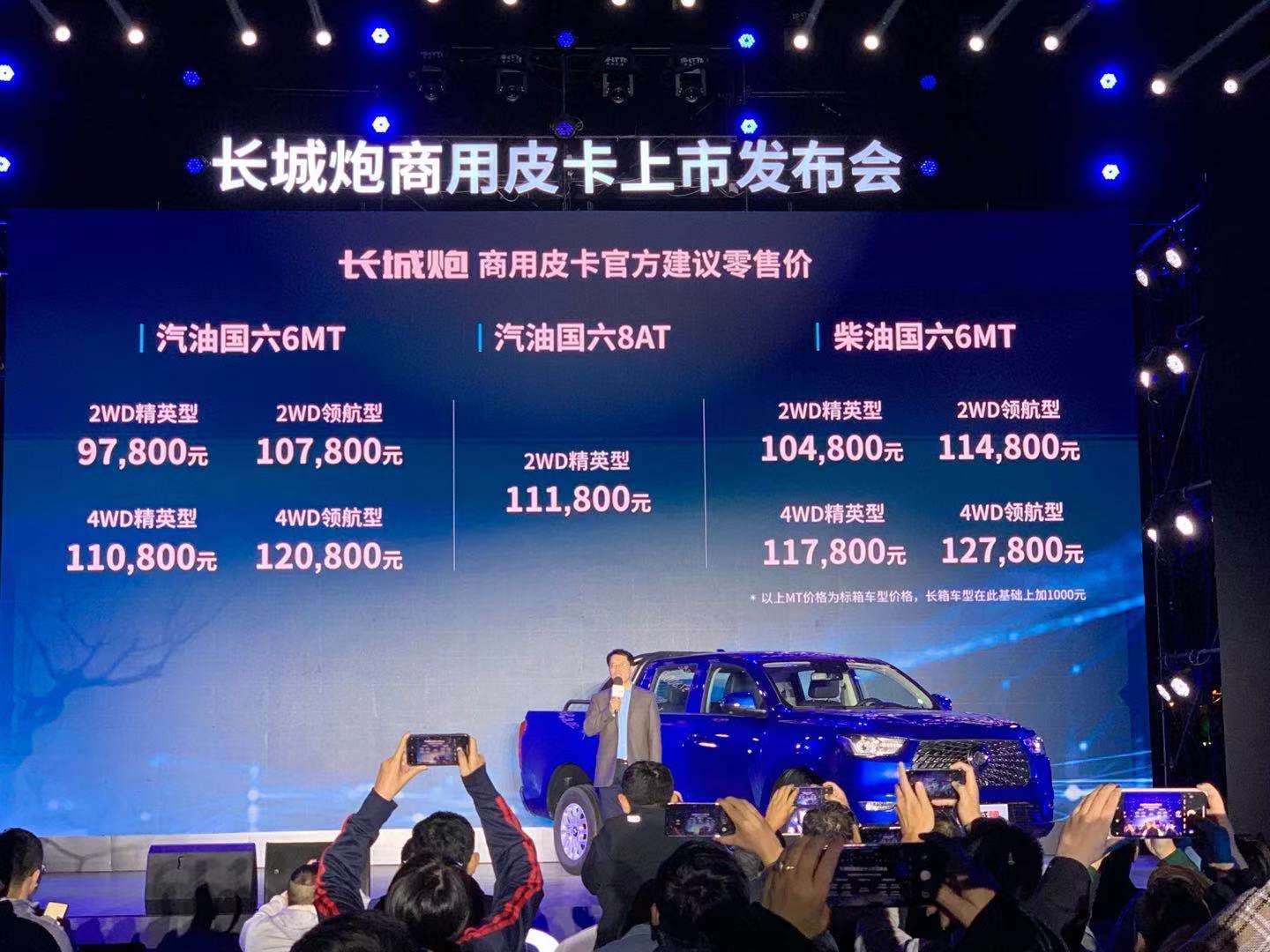2019年10月24日,长城炮商用版正式上市。新车搭载满足国六b排放标准汽/柴两款动力、8AT/6MT两种变速器,有长/标货箱两种尺寸、精英/领航两种配置,并配有3种货箱盖,共推出
