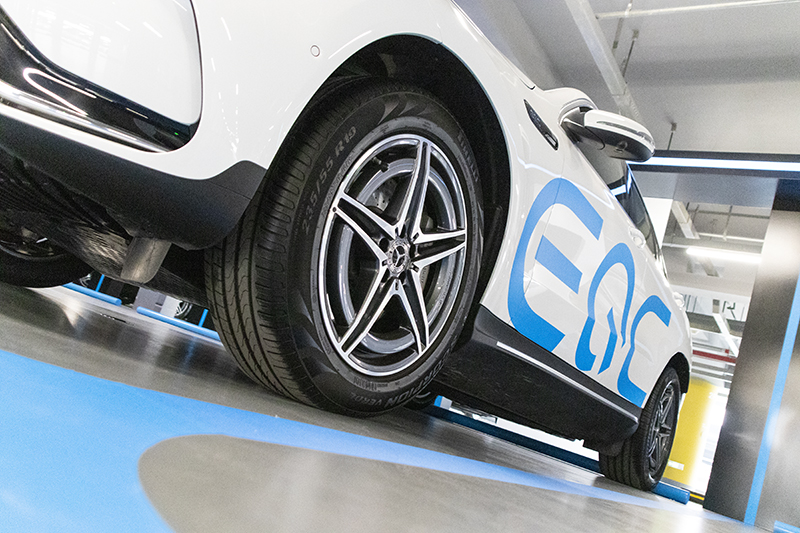 车身侧面,线条非常流畅修长,D柱溜背的设计,营造出Coupe车身效果。在两侧的前翼子板处,还有“EQC”字样的标识;在车身的右后侧翼子板上,新车配备有直流快速充电接口,最高可支持110kW的充电功率;在右后方的包围上,设置有一个交流慢速充电接口,该位置在倒车入库后,可以很方便进行充电。车身尺寸方面,新车长宽高分别为4774/1923/1625mm,轴距2873mm。