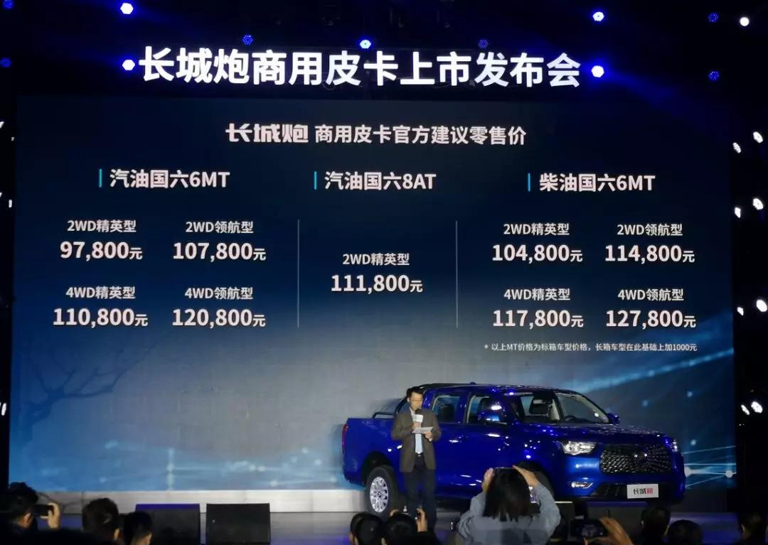 10月24日,长城炮商用版也正式上市,售价9.78-12.78万元(长箱版在此基础上+1000元),并提供了柴油/汽油、6速手动/8速自动、两驱/四驱、标准轴/长轴、长箱/短箱等多达17种组合搭配,给予了消费者充分的选择空间。