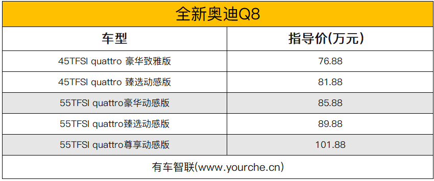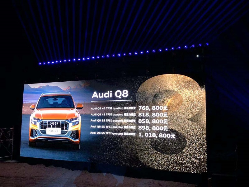 2019年10月25日,奥迪Q8 (配置|询价)正式上市,作为奥迪家族中的全新的旗舰级SUV,定位于豪华中大型SUV。新车基于MLB evo平台打造,外观上八边形进气格栅搭配两侧矩阵式LED灯组,辨识度极高;动力方面,该车搭载2.0T和3.0T两款发动机,全系标配8AT变速箱和quattro四驱系统。此次共推车5款车型,售价区间76.88万-101.88万元之间。