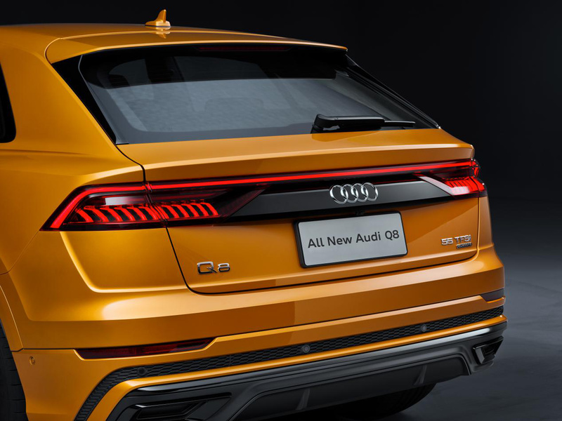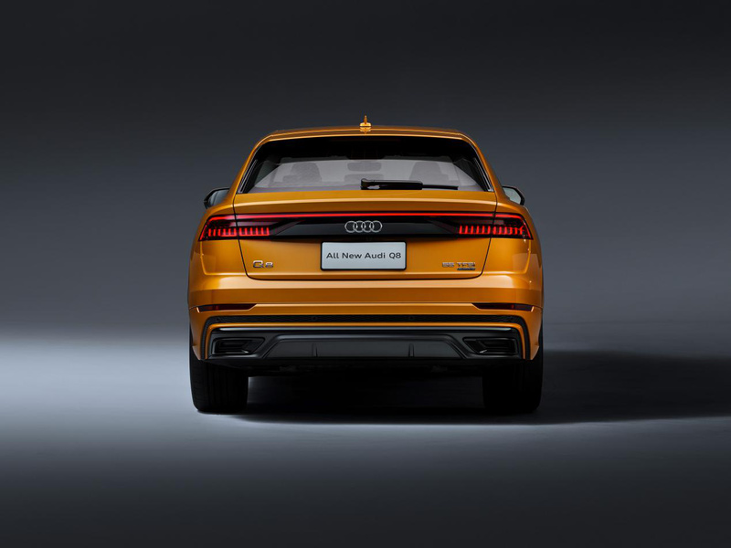车辆尾部,全新奥迪Q8整体设计延续了概念车风格,尾灯采用贯穿式设计,内部并运用OLED光源,辨识度极高。并且这项设计在白天或黑夜还可产生独立的灯光标识。排气布局上该车采用了双边共两出排气。
