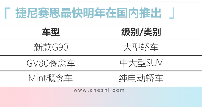 今年上半年,现代汽车已经在国内成立了Genesis品牌的销售公司,名为“捷尼赛思汽车销售(上海)有限公司”,注册资金为5000万美元,意味着该品牌即将进入到中国市场销售。近日,网上车市了解到,Genesis品牌的中文名称确定为“捷尼赛思”,并将于11月5日在国内发布3款车型,包括新款G90 (配置|询价)、GV80 (配置|询价)概念车以及Mint 概念车。其中,新款G90为捷尼赛思的旗舰车型,海外版整体尺寸及动力均与奔驰S级相近。