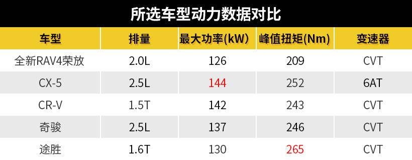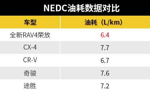 动力方面,全新RAV4荣放搭载2.0L自然吸气发动机和2.5L混合动力系统,均可满足国六排放标准,最大功率分别为126kW和163kW,传动系统分别匹配CVT和E-CVT变速箱,混动版车型NEDC油耗为5L/100km,燃油版油耗6.4L/100km。