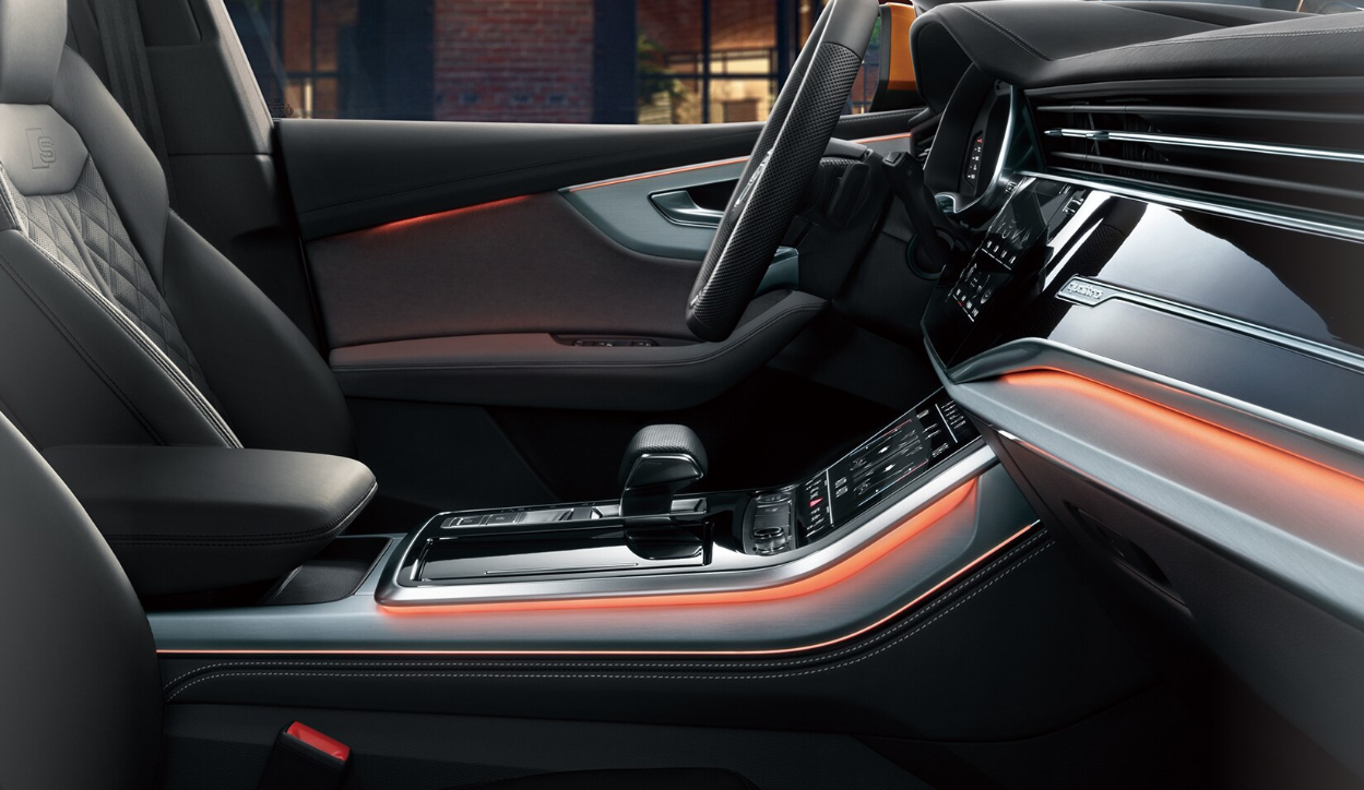 值得一提的是,在内饰氛围灯设计上,奥迪Q8采用了特殊的光导纤维,外部环境变暗时,照明原件凸显了车辆的内部设计,空调温度改变时,轮廓灯闪烁,同时在不同区域还可以独立选择氛围灯颜色。