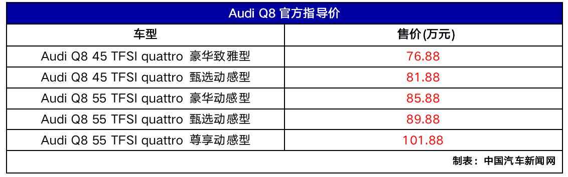 10月25日,奥迪旗下旗舰SUV Q8将正式上市。此次上市新车共推出5款车型,售价区间76.88-101.88万元,作为目前在国内市场的旗舰SUV车型,新车与兰博基尼Urus、保时捷卡宴 (配置|询价)、宾利添越同平台生产,同时搭载3.0T发动机,并采用了48V轻混技术。