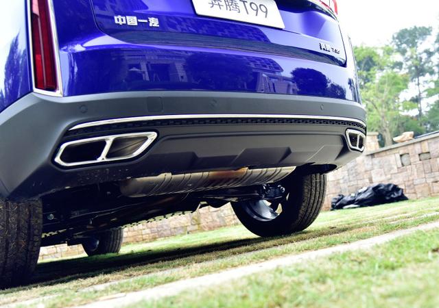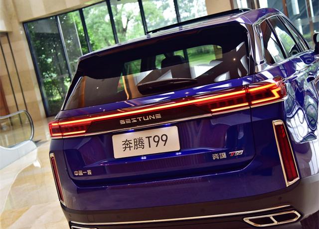 车身侧面,奔腾T99采用了众多的平直线条处理,起到了一定的拉伸感,而车顶微微下压的弧线让它看起来没有那么死板。双色多辐轮圈第一眼看上去也很有气质,让人有眼前一亮的感觉。车尾最醒目的当属贯穿式尾灯设计,点亮后辨识度非常高;双边共四出的排气布局看起来也很唬人,让整体具有不错的层次感。车身尺寸方面,新车的长宽高分别为4800mm,1915mm,1685mm,轴距为2870mm。虽然整体尺寸略微小于长安CS95 (配置|询价)和荣威RX8,但轴距略占优势。