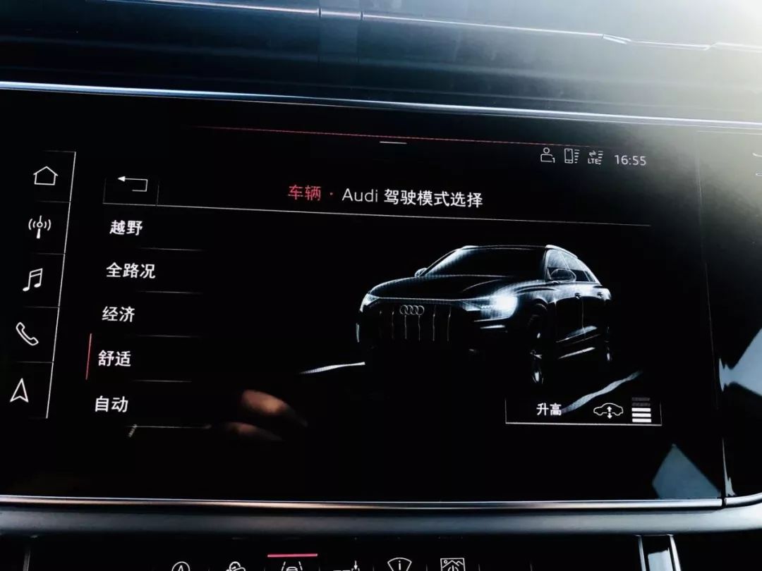 越野能力也是这台旗舰SUV的强大之处。Q8标配纯机械中央差速器的Quattro全时四驱系统,前后轴动力分配比例为40:60,必要时可将动力传递至牵引力较好的车轴,极限情况下可以做到70:30或15:85。配备了自适应空气悬架,可根据路况让驾驶者自行调整到舒适、自动、动态、高效、个性化、全路况和越野七种模式。根据驾驶模式的不同,底盘高度最大也可以有90mm的调节幅度,在选择到越野模式,最小离地间隙达到254mm。