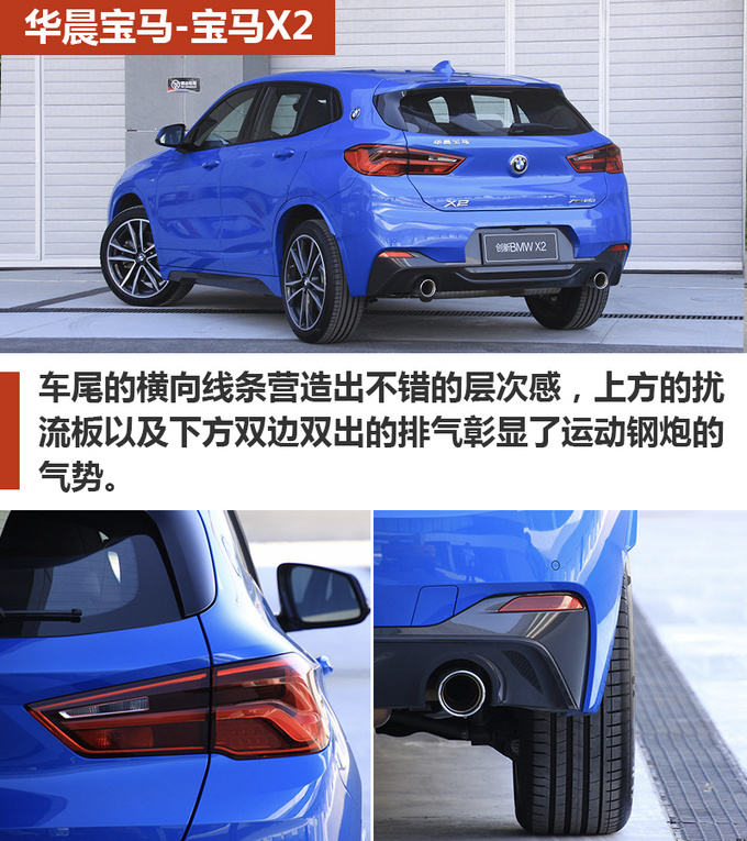 宝马X2最大的特点就是跨界的运动范儿,溜背的设计配合上双边双出的运动排气以及M运动套件,相信每一个年轻人的都会驻足观看吧。
