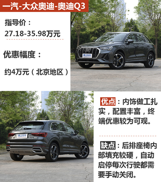 奥迪Q3 (配置|询价)是本次车市严选最为推荐的车型,原因很简单,它的各方面表现都非常均衡,不论是奥迪的豪华属性、内饰的设计及丰富的配置都令人挑不出毛病,同时还提供三种动力总成可选,极大程度满足不同人群的需求,目前北京地区的优惠幅度较大,推荐有需求的朋友着重考虑。