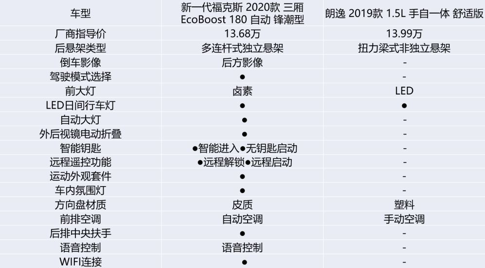 对比两款车的差异性配置可见,新一代福克斯2020款 三厢 EcoBoost 180自动锋潮型多出了全景天窗、倒车影像、驾驶模式选择、自动头灯、电动后视镜折叠、无钥匙进入/启动、远程启动、语音交互、自动空调、车内wifi等一系列超实用的配置。而朗逸仅在LED头灯方面比新一代福克斯占优。