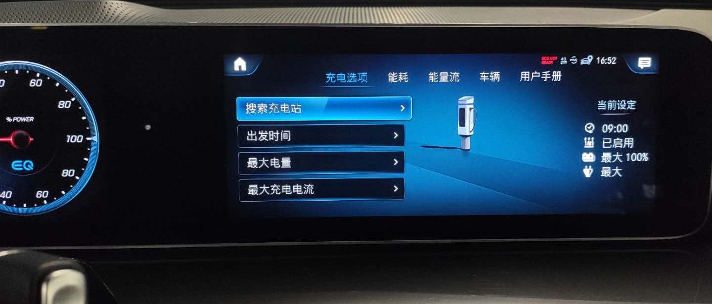 MBUX车机系统专为电动车加入的EQ选项,内部集成能耗、电量、能量流、搜索充电站等多项选项