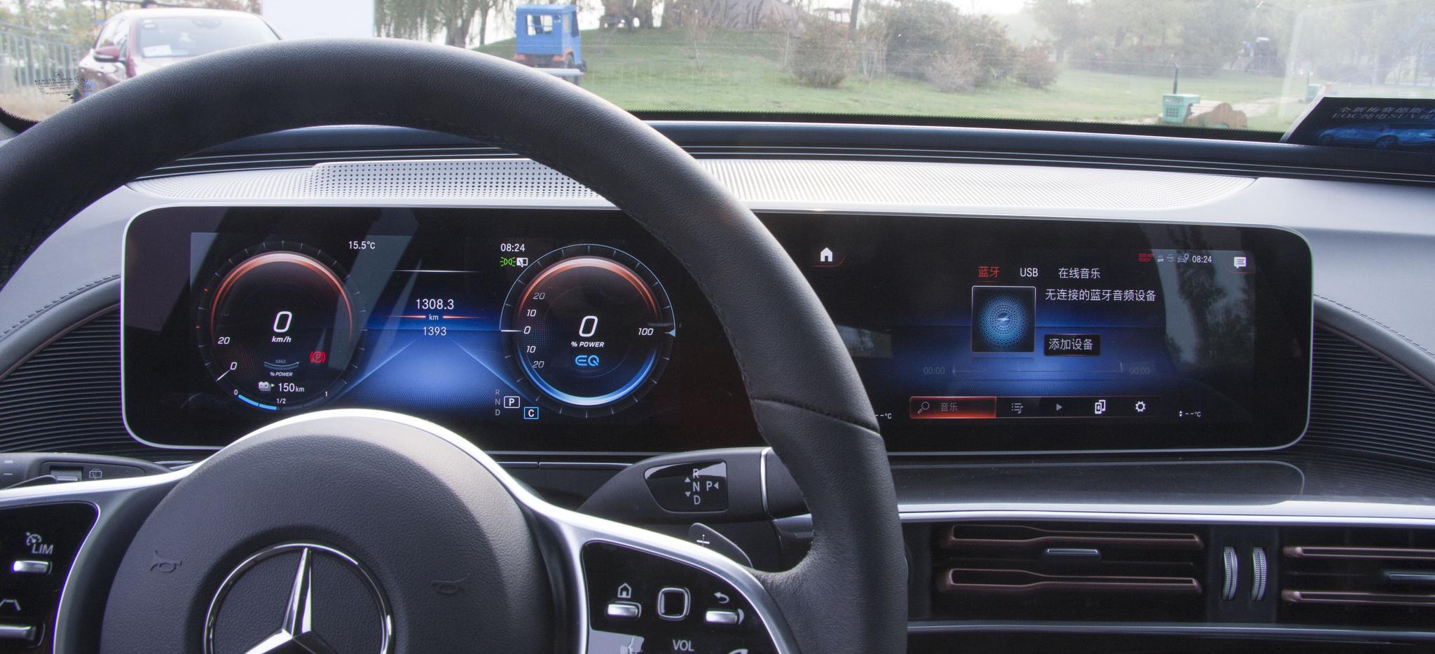 虽然这个双10.25英寸的双联屏在造型上与奔驰燃油版车型没什么不同,但其搭载的MBUX智能人机交互系统已经根据电动车的相关功能进行了优化设计。中控屏包括车辆控制、导航、音乐、电台、商店等常规功能,支持CarPlay和Carlife智能手机互联服务。