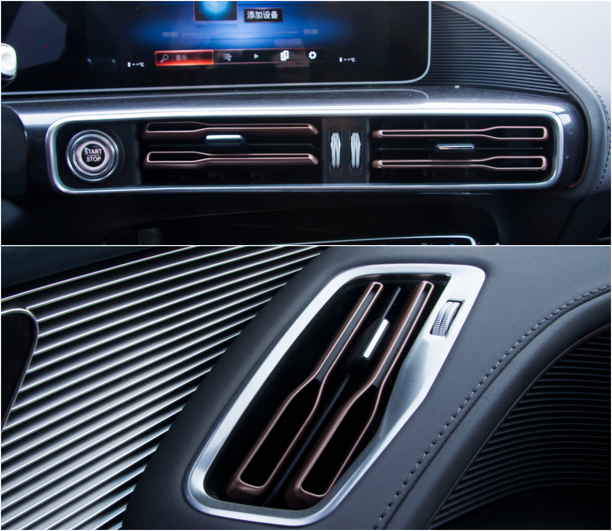 空调出风口的造型设计新颖,采用钥匙状造型以及玫瑰金饰条装饰,是EQC的专属特色