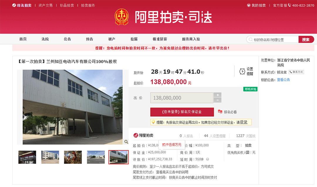 日前,在阿里司法拍卖网站上,兰州知豆电动汽车有限公司100%股权被浙江省宁波市中级法院处置拍卖,起拍价为1.3808亿元,评估价约为1.9725亿元。据悉,本次拍卖的100%股权包括土地、生产线、厂房等固定资产以及知豆手中的纯电动乘用车生产资质,竞拍时间为2019年11月24日10时至2019年11月25日10时止。