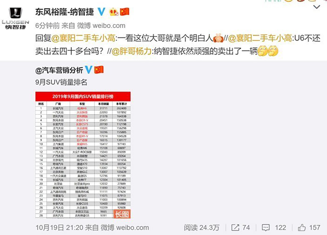 近日,某汽车博主公布了9月SUV销量排名。榜单显示,纳智捷9月只有两款车型有销量数据,分别是纳智捷U5 SUV销量为1台和优6 SUV销量为41台。有网友评论:(纳智捷)U6卖出四十多台。纳智捷官方微博回复评论称“一看大哥就是明白人”,间接承认纳智捷9月卖了四十多台。