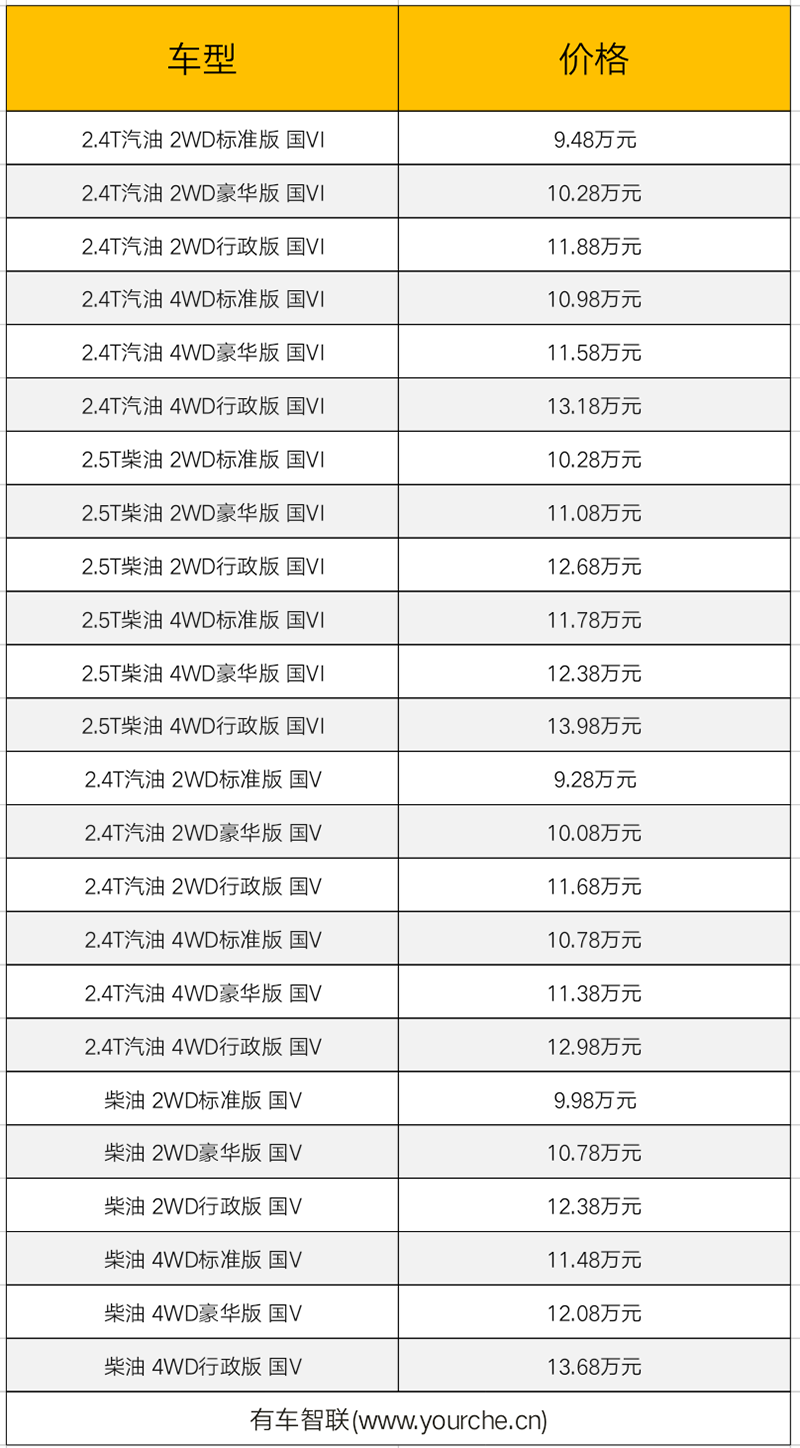 动力部分,新车将搭载云内动力1.9T柴油发动机、江西五十铃2.5T柴油发动机,以及沈阳航天三菱4K22D4T汽油发动机(年内推出)。其中1.9T柴油机最大功率150马力、峰值扭矩350牛·米;2.5T国五版柴油机最大功率129马力、峰值扭矩320牛·米;2.5T国六版柴油机最大功率150马力,峰值扭矩360牛·米;2.4T汽油机最大功率218马力、峰值扭矩320牛·米。传动系统方面,新车先期提供6速手动变速箱,可选后驱和四驱车型。此外,搭载6速或8速手自一体变速箱的自动挡车型将于2020年投放市场。