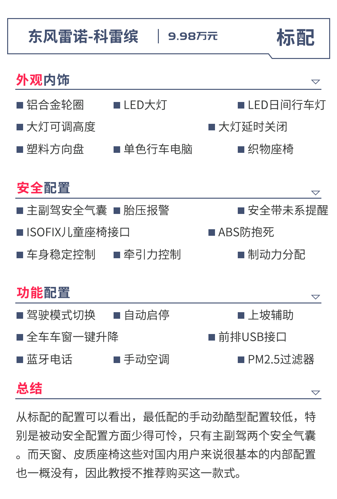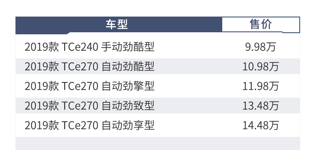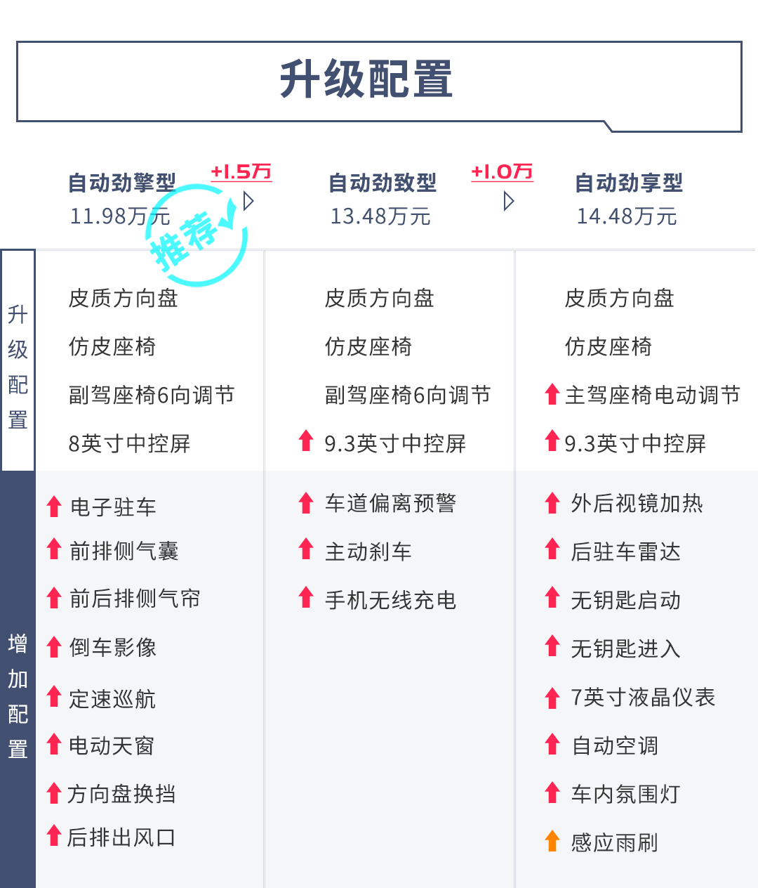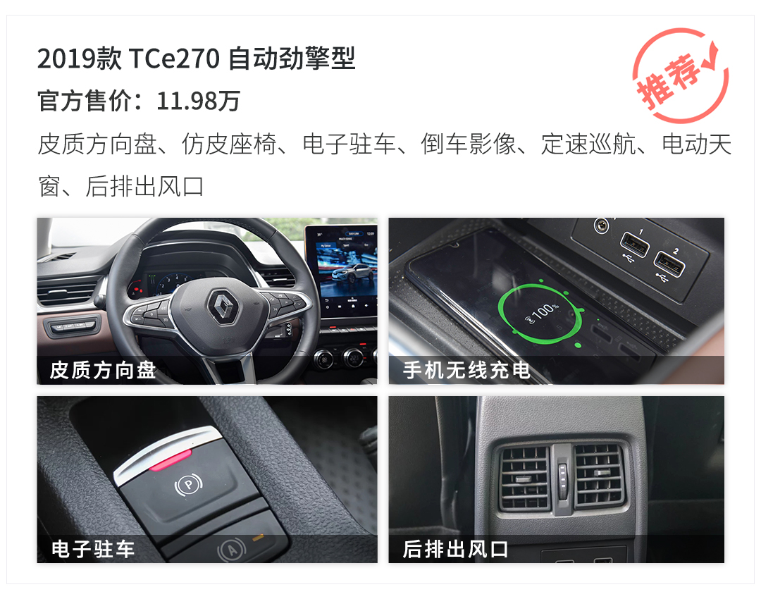 教授最推荐的就是11.98万的中配劲擎型。首先,国人最看重的皮质方向盘、仿皮座椅、倒车影像、电子驻车、后排出风口、天窗这些舒适性配置全都配齐了,而且日常使用几率很高;其次,安全性配置也相对齐全,气囊数量够,车身稳定控制也没落下,心里稳当;另外价格也很合适,12万不到买一台配置还挺丰富的小型合资SUV,非常划算。