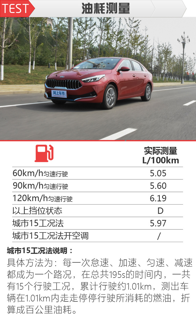 60km/h的匀速巡航工况,是城市道路中最为常见的法定限速,日常驾车会经常以此速度行驶。经过测试,全新一代K3插电混动在60km/h的速度下,有一半情况下由于纯电机工作的原因油耗为零,另外一半的情况下发动机参与工作,因此最终油耗数据为两者的平均成绩,油耗成绩仅为5.05升,远低于同级车型。