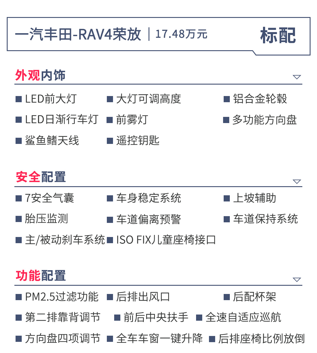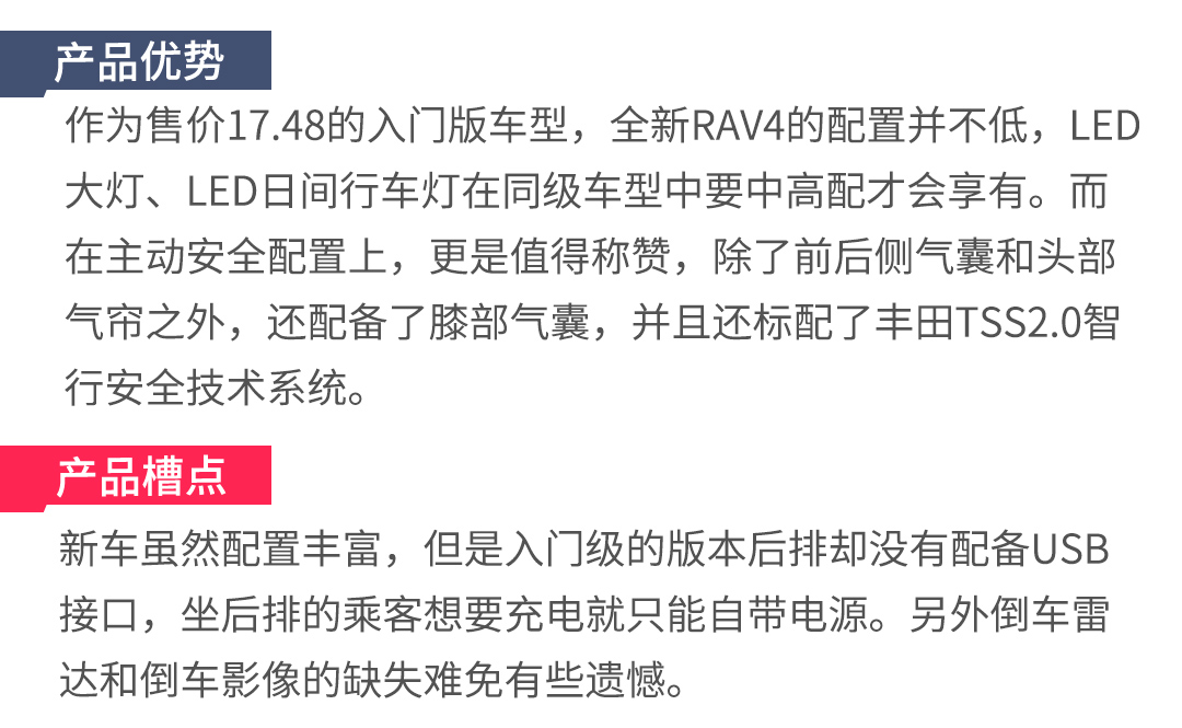 可以看出全新RAV4是一款很注重安全性能的车,哪怕是全系的最低配,安全配置方面一点也不含糊,标配7个安全气囊和丰田TSS2.0智行安全技术系统。该系统集预碰撞系统、动态雷达巡航、车道偏航警示、车道循迹辅助以及自动远近光灯系统为一体。
