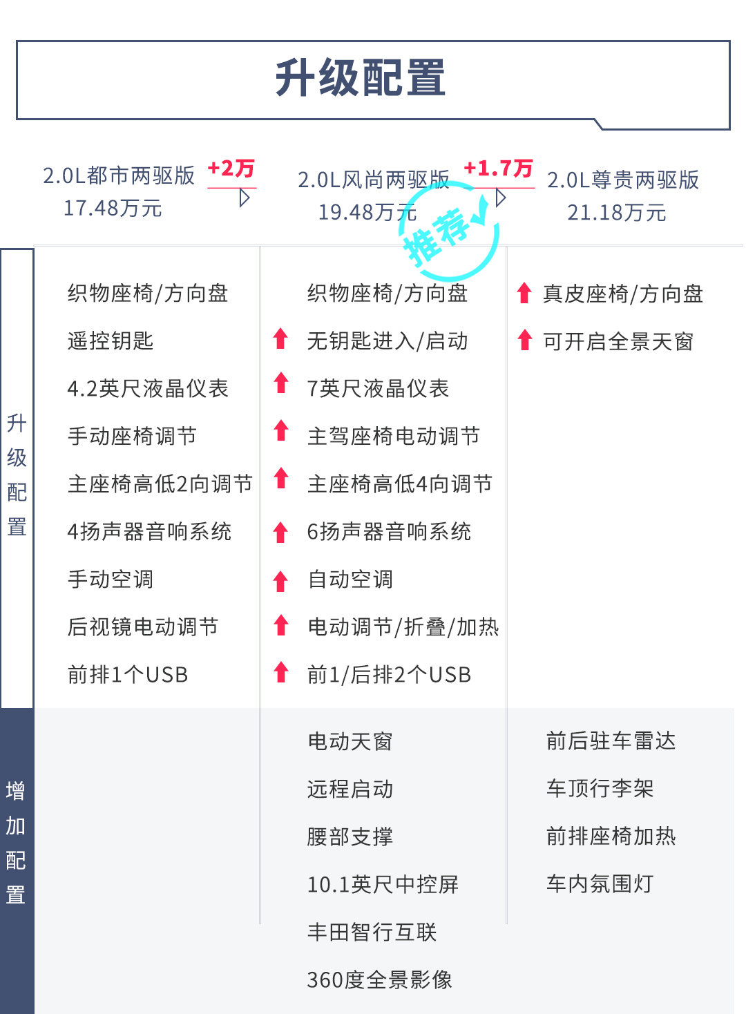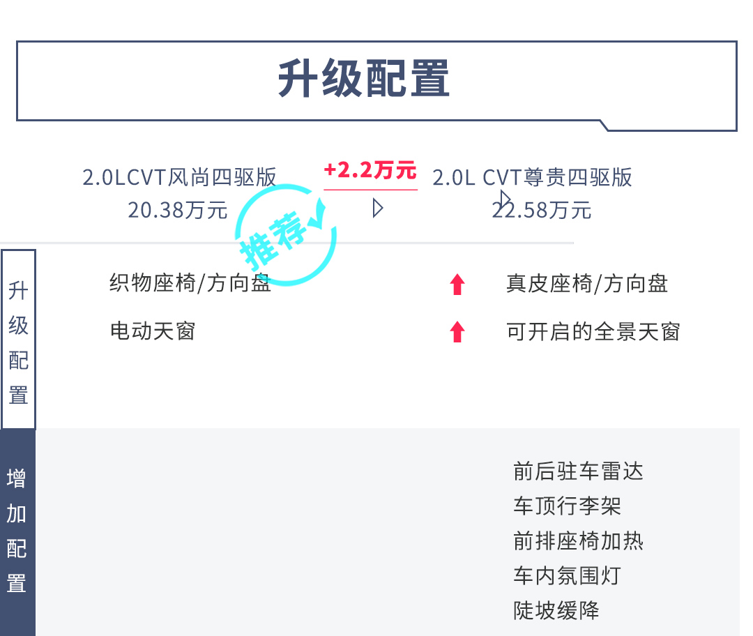 在2.0L四驱车型中,尊贵四驱版比风尚四驱版贵了2.2万元,配置上主要升级了真皮座椅/方向盘和全景天窗,并且增加了前后驻车雷达、车顶行李架、前排座椅加热、车内氛围灯、陡坡缓降。