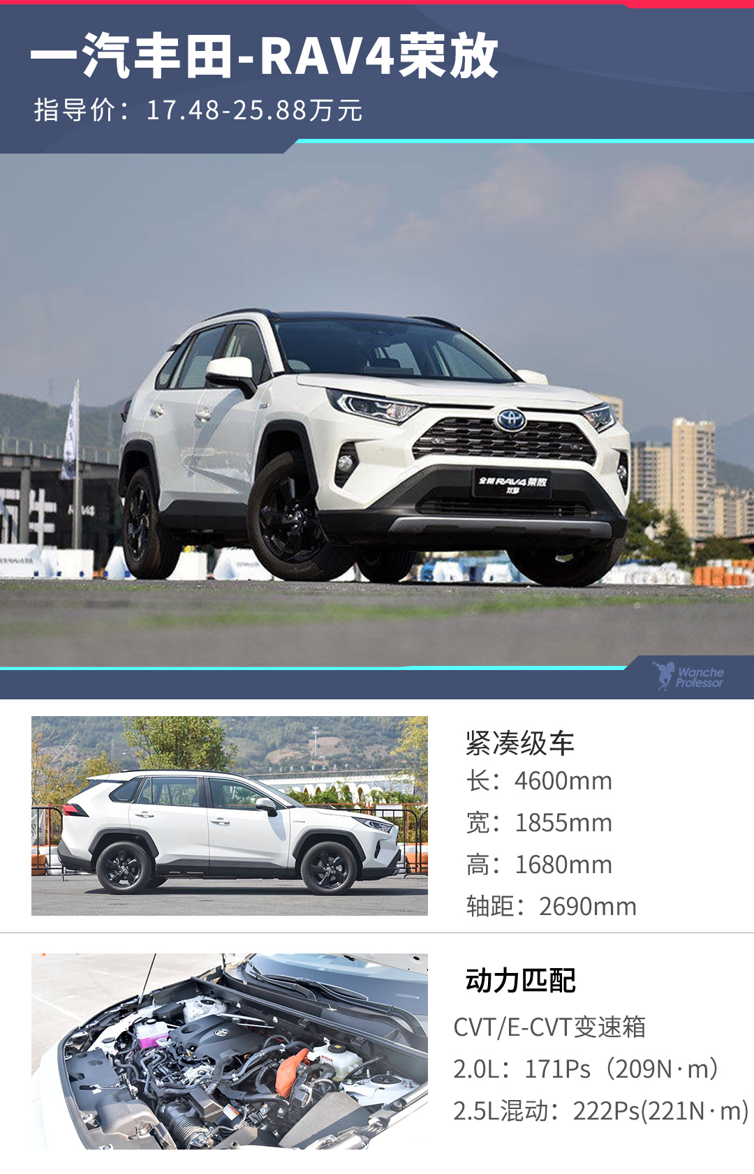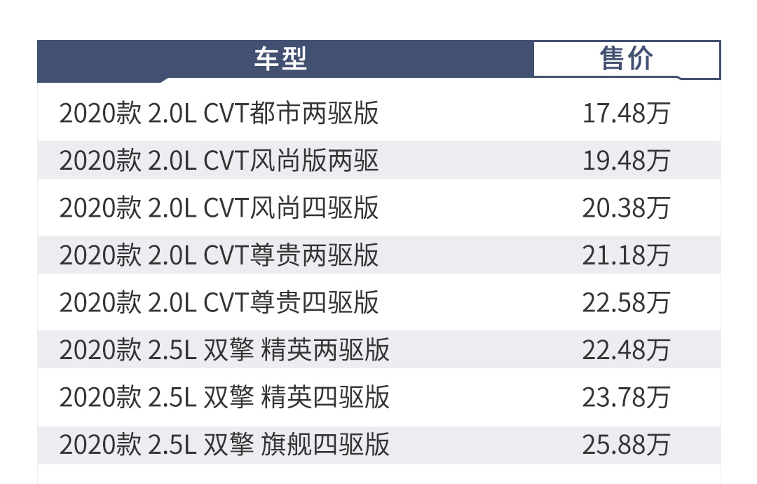 全新一代RAV4荣放 (配置|询价)于10月25正式上市,新车提供2.0L和2.5L双擎两种动力共计8款车型,售价区间为17.48-25.88万元。8款车型中,又该如何选?本篇购车手册,教授将结合售价和配置为您推荐合适的车型。
