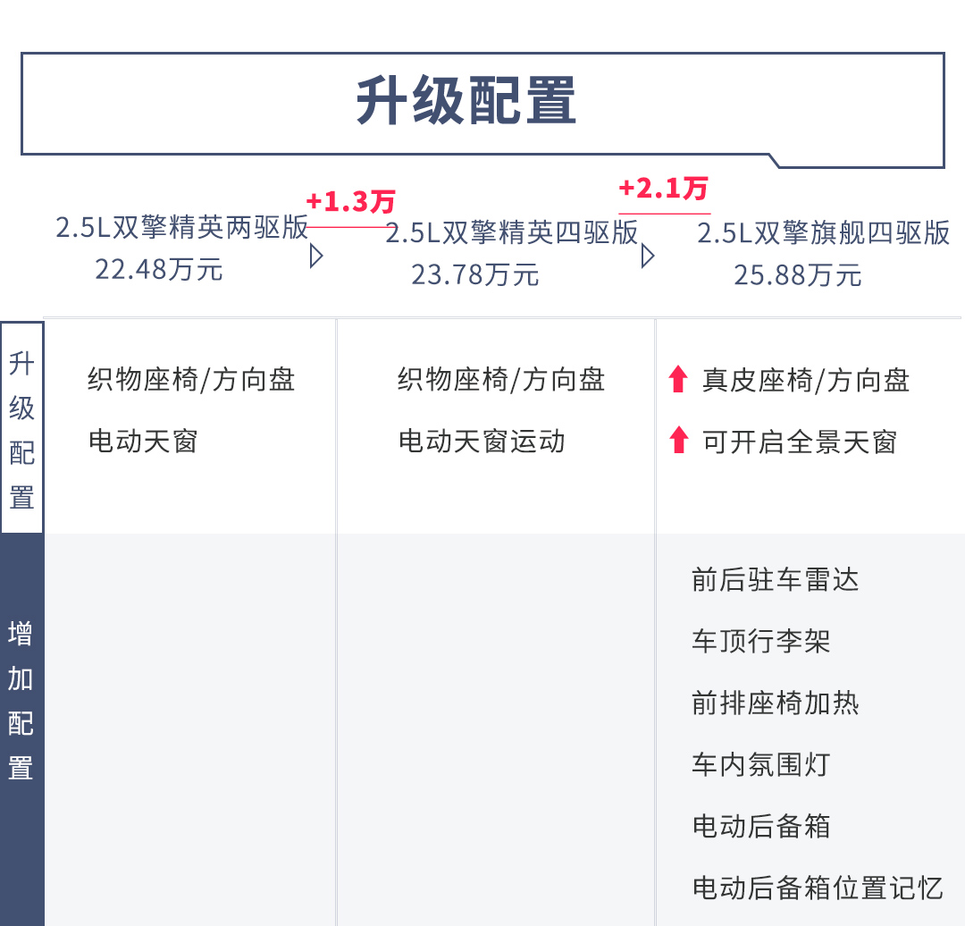 在2.5L双擎的三款车型中,精英四驱版比精英两驱版贵了1.3万元,两车在配置上没有区别,前者主要增加了一套四驱系统。而作为顶配车型,2.5L双擎四驱旗舰型售价比四驱精英型贵了2.1万元,但配置也相应增加了一些,包括真皮座椅/方向盘,全景天窗、前后驻车雷达、前排座椅加热、氛围灯以及带位置记忆的电动尾门。