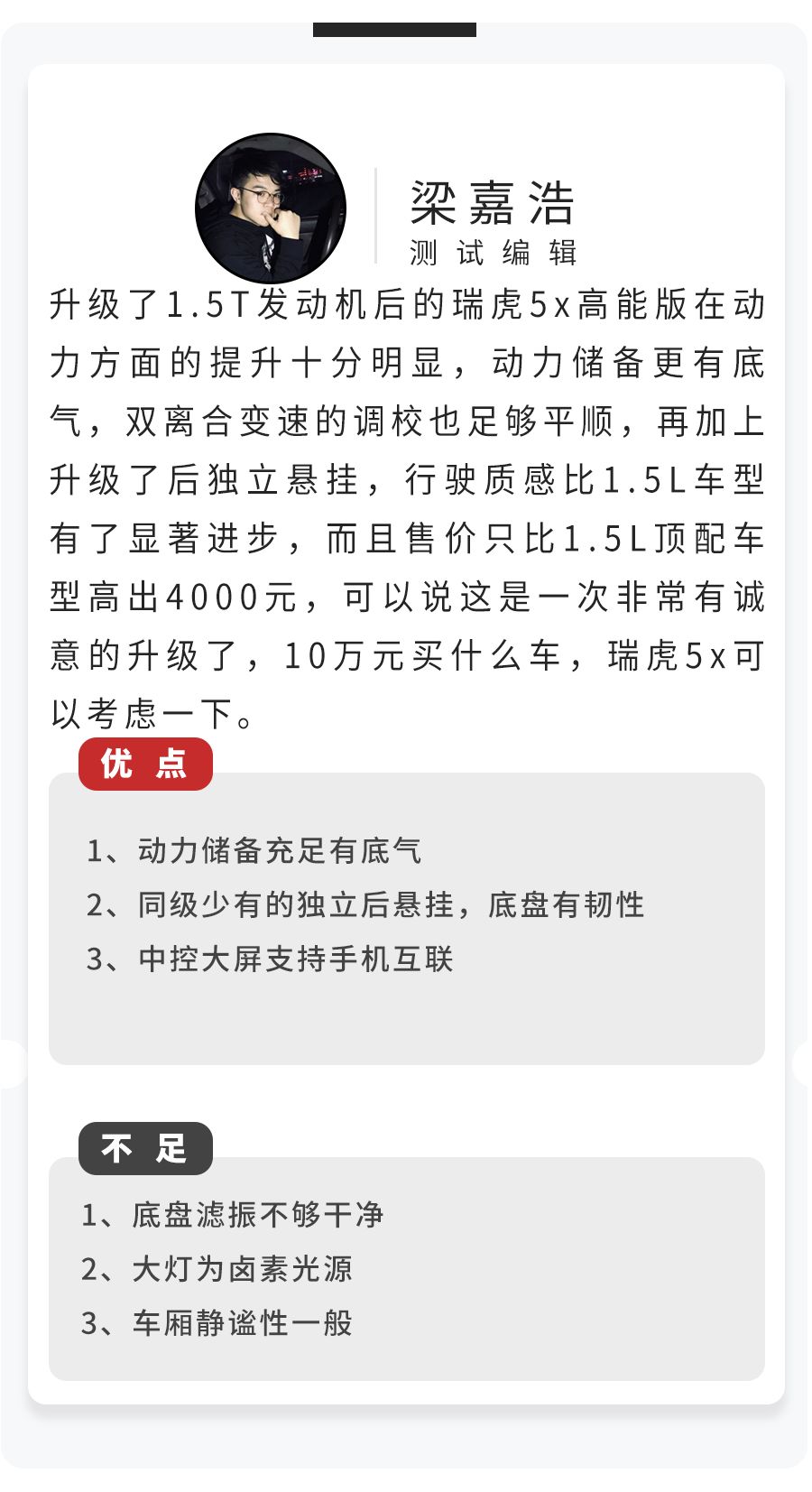 奇瑞瑞虎5x (配置|询价)也是畅销国产小型SUV之一,只不过势头就没有缤越 (配置|询价)、CS35 PLUS、GS3那么强,位列国产小型SUV销量排行榜第四位。总结原因,前三名都推出了更强的动力版本(1.5T/1.4T),而瑞虎5x还是那一副1.5L自然吸气发动机,好像有点跟不上节奏,也很难满足年轻消费者对动力的要求,所以厂家也及时作出了调整,推出了瑞虎5x HERO 1.5T高能版(下文简称瑞虎5x高能版),售价8.99万元,刚好满足10万元落地的标准,事不宜迟,我们马上开始这期有车试驾。