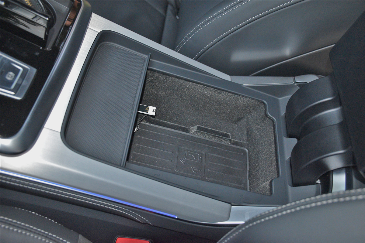 后方的中央扶手箱容积也不算大,内部前面可以放一些票据、零钱等杂物,后面有一个手机的无线充电面板,旁边是一个小的储物格。