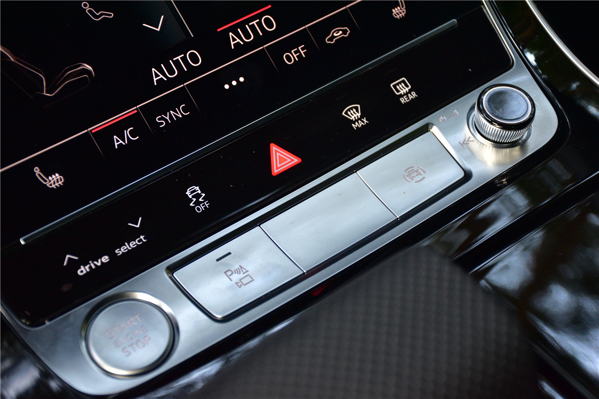 在空调控制的屏幕下方,实体按键仅仅保留了启动按钮等为数不多的几个,驾驶模式的选择、ESP开关和危险报警灯等几个按钮也采用了按压式的触控设计。游艇式的电子档杆表面包裹着打孔真皮,宽大的样式使得它的握感也十分饱满。