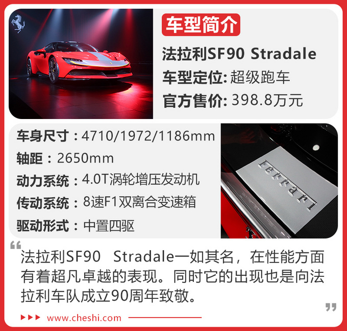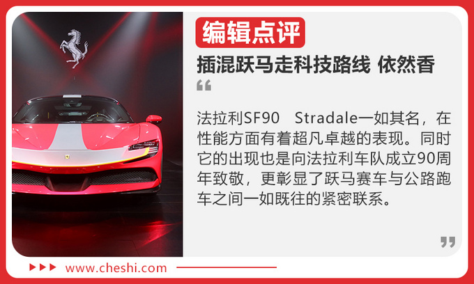 法拉利SF90 Stradale一如其名,在性能方面有着超凡卓越的表现。同时它的出现也是向法拉利车队成立90周年致敬,更彰显了跃马赛车与公路跑车之间一如既往的紧密联系。