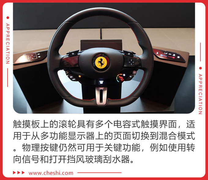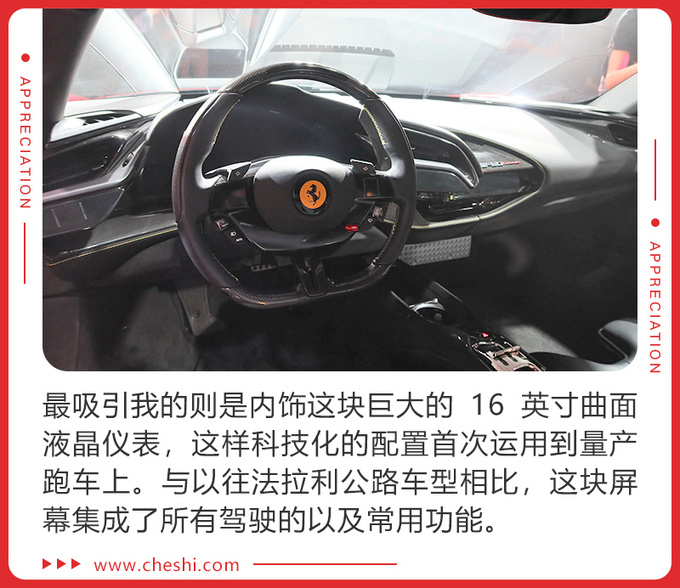 最吸引我的则是内饰这块巨大的 16 英寸曲面液晶仪表,这样科技化的配置首次运用到量产跑车上。与以往法拉利公路车型相比,这块屏幕集成了所有驾驶的以及常用功能。触摸板上的滚轮具有多个电容式触摸界面,适用于从多功能显示器上的页面切换到混合模式。物理按键仍然可用于关键功能,例如使用转向信号和打开挡风玻璃刮水器。基本上除了几个按键旋钮之外,其余都是触控式操作的,就连一键启动也是设计成触控的。