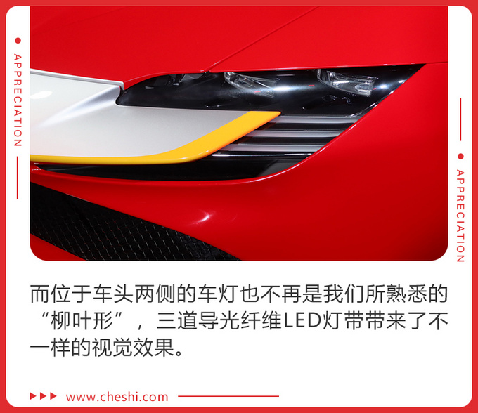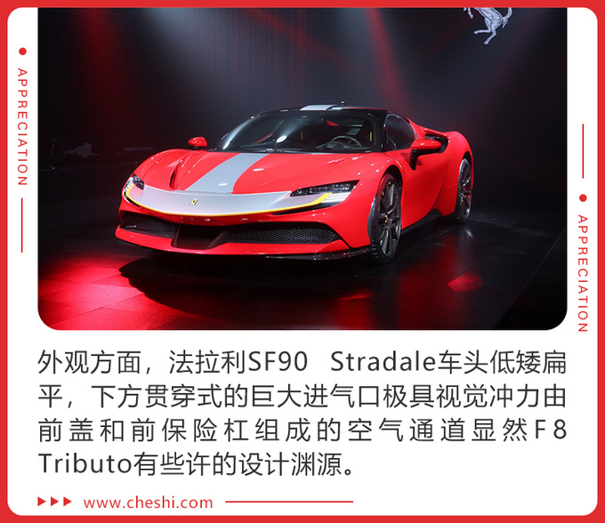 外观方面,法拉利SF90 Stradale车头低矮扁平,下方贯穿式的巨大进气口极具视觉冲力由前盖和前保险杠组成的空气通道显然F8 Tributo有些许的设计渊源,空气经此流过前挡风玻璃,降低风阻的同时也为前桥创造了可观的下压力。位于车头两侧的车灯不再是我们熟悉的“柳叶形”,三道导光纤维带来了不一样的视觉效果。