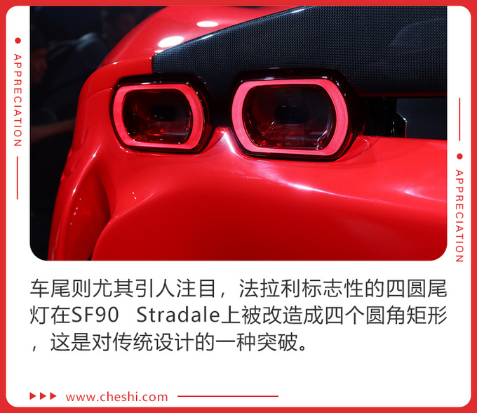 法拉利SF90 Stradale的进气口设计在 B 柱靠上的位置,而在车顶往后一点的地方有一个横向的大型出风口,在SF90 Stradale高速行驶时发动机舱里的热气流就会在负压作用下被吸出机舱。它的后“挡风玻璃”可以选择与F40一致的百叶窗样式,进一步有利于导出热量。车尾则尤其引人注目,法拉利标志性的四圆尾灯在SF90 Stradale上被改造成四个圆角矩形,这是对传统设计的一种突破。为了给后保险杠位置的巨型碳纤维扩散器留地方,两个口径可观的排气管被移到车尾比较高的位置。车辆尾部设计了可关闭的襟翼,与双层式大尺寸扩散器一道在不加大空气阻力的前提下,大大增加车尾的下压力。