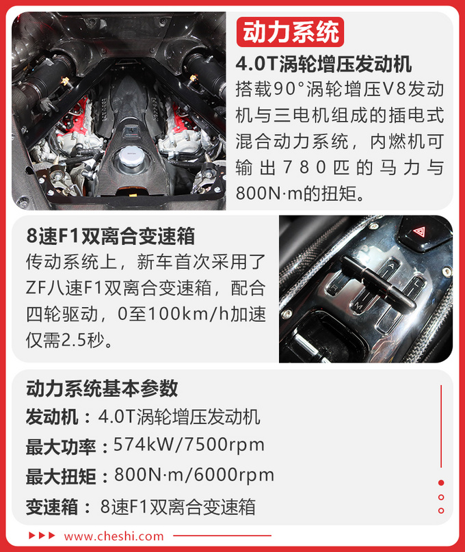 传动系统首次采用ZF八速F1双离合变速箱,配合四轮驱动,0至100km/h加速仅需2.5秒,0至200km/h加速亦只需6.7秒,极速高达340km/h!Manettino 驾驶模式提供 Wet 、Sport 、Race 、CT off 和 ESC off 选项,方向盘左侧还提供四种不同电力输出模式:eDrive-纯电模式(内燃机关闭,车辆由前轮驱动)、Hybrid -(混动模式(默认) 由电脑管理内燃机与电机的输出,内燃机可输出功率峰值)、Performance - 性能优先模式(引擎会保持运转用作充电,并提供较即时的动力输出)、以及Qualify - 最强模式(该模式下三电机的总功率输出才能达到220马力,再加上内燃机的780马力,总功率输出1000马力)。