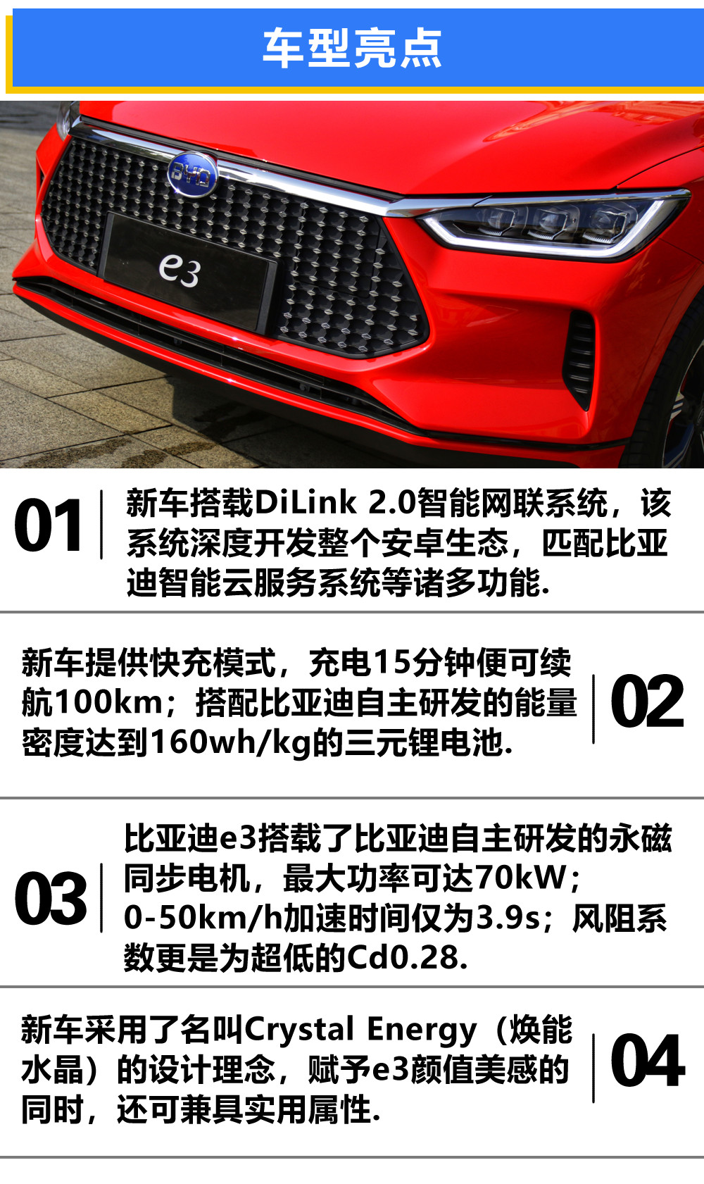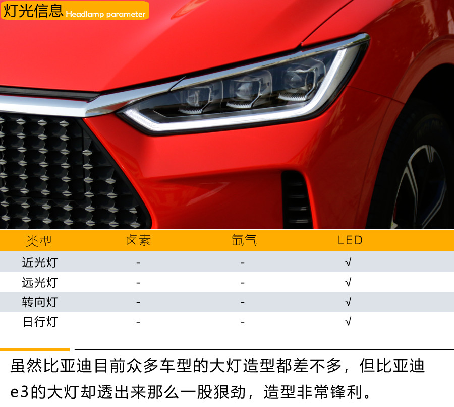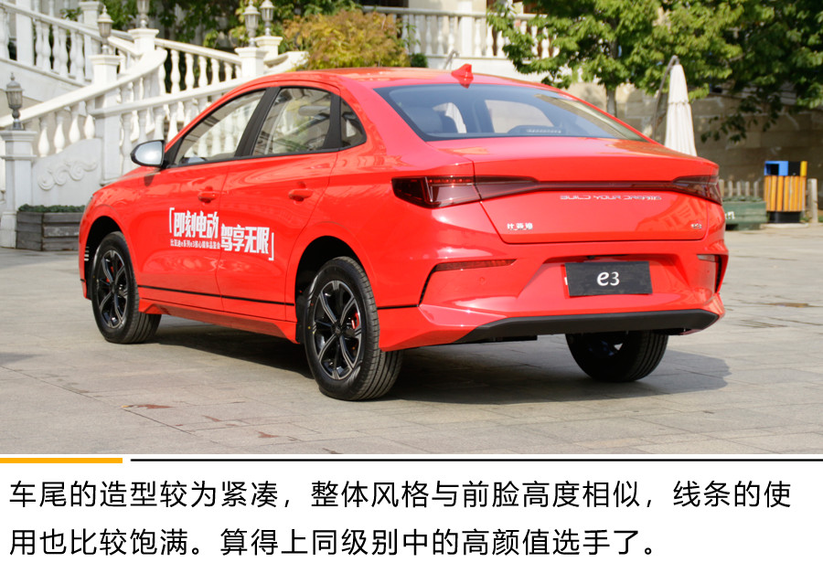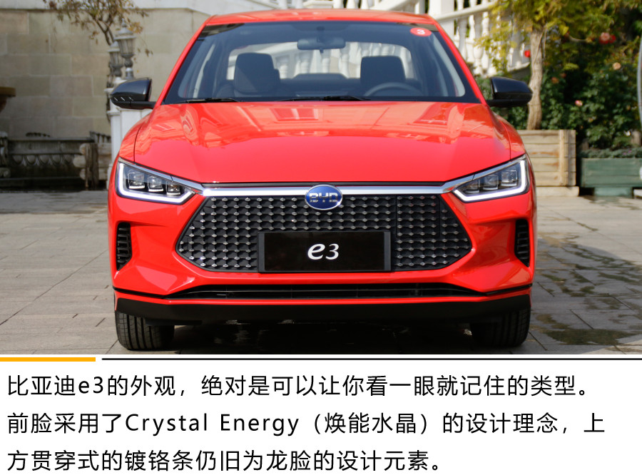 比亚迪e3的外观,绝对是可以让你看一眼就记住的类型。前脸采用了Crystal Energy(焕能水晶)的设计理念,上方贯穿式的镀铬条仍旧为龙脸的设计元素。